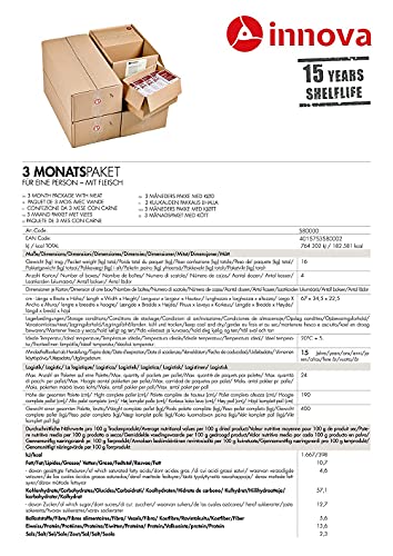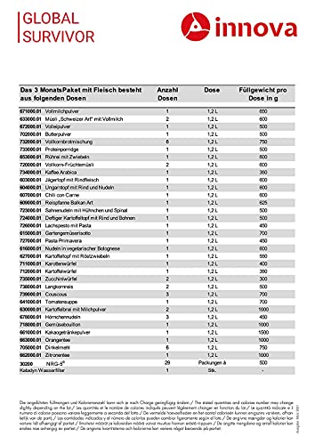 Unsere dehydrierten Lebensmittel werden unter speziellem Vakuum und der nötigen Schutzatmosphäre in Dosen abgepackt und dicht verschweißt. Durch dieses spezielle Verfahren, ergibt sich eine extrem lange Haltbarkeit. Nach dem Trocknungsprozess verlieren die Nahrungsmittel in etwa 90 Prozent ihres ursprünglichen Gewichtes und vorangehenden Volumens. Durch eine Wasserzugabe erhalten Sie das ursprüngliche Gewicht und die Konsistenz wieder zurück ohne Einbußen von Geschmack oder Qualität. Somit sparen Sie nicht nur Platz, sondern es erleichtert ihnen auch die Lagerung. Vor allem eine schnelle und einfache Zubereitung ist mit unseren Produkten absolut gewährleistet. Die Lebensmittel sind speziell entwickelt worden für eine einfache Lagerung sowie den Einsatz in Krisenzeiten. Schmackhafte Menüs, Grundnahrungsmittel, Wasserfilter und NRG-5. Nahrungsmittel für drei Monate für eine Person. Täglich mind. 2000 kcal. Inhalt: 52 x 1,2 lt. Dosen 29 x NRG-5 Notration à 500gr 1 x Wasserfilter BeFree 0,6 lt Tageskalorienanzahl: mind. 2000 kcal Gesamtkalorienanzahl: 182.581 kcal Datenblatt 3 Monatspaket mit Fleisch Sämtliche Dosen sind mit Aufreißdeckeln versehen und können mit den dazugehörigen Kunststoffdeckeln wieder verschlossen werden. Bitte beachten Sie, daß die Lebensmittel beim Trocknungsprozeß bis zu 90% an Gewicht verlieren und bei Wasserzugabe die ursprüngliche Menge wieder erhalten. Es eigent sich als Notverpflegung, Notvorrat, Langzeitnahrung Notfallnahrung, Emergency Food und Survival Food