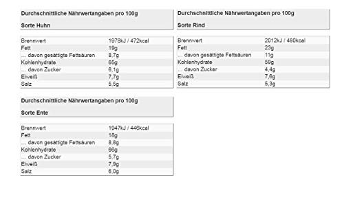 Inhalt: 30x60g (10x60g Ente, 10x60g Huhn, 10x60g Rind)