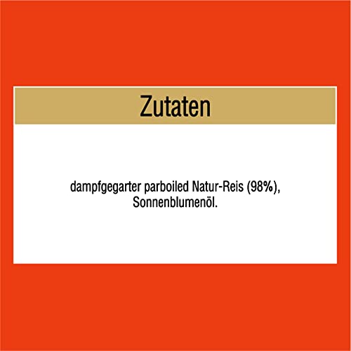 Zutaten: dampfgegarter parboiled Natur-Reis (98%), Sonnenblumenöl.