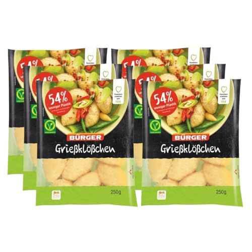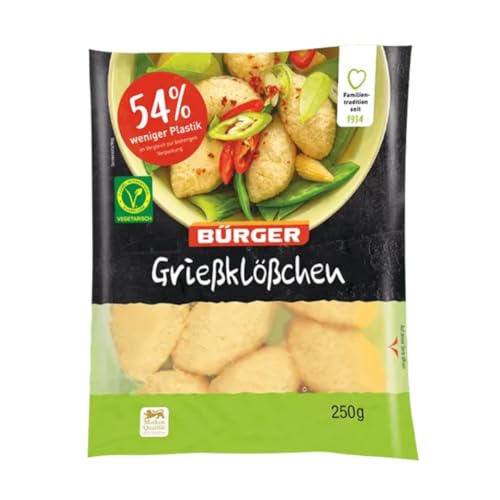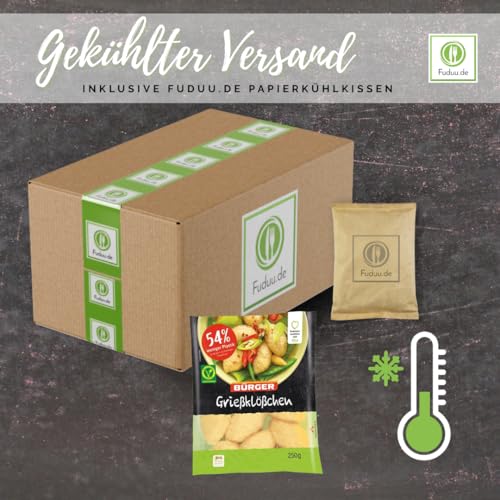 Verleihen Sie Ihren Gerichten das gewisse Etwas: Die Bürger Grießklößchen aus hochwertigem Hartweizengrieß und Vollei zergehen auf der Zunge. Ob als feines Entrée in Suppe, als süße Variante mit frischen Früchten oder für kreative Rezepte – diese Klößchen sind ein Genuss für jede Gelegenheit. Praktisch im 250 g Beutel, einfach zuzubereiten und perfekt für Suppen, Desserts oder Zwischendurch. Inklusive wiederverwendbarem Fuduu Kühlakku! Halbarkeit: Bei durchgehnder Kühlung bei max. 7°C haben unsere Grießklöße nach der Ankunft bei Dir eine Restlaufzeit von mindestens 1 Woche. Geöffnet kann man sie noch gut 1 bis 2 Tage im Kühlschrank aufbewahren