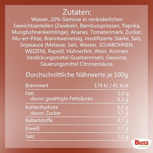 Wasser, 20% Gemüse in veränderlichen Gewichtsanteilen (Zwiebeln, Bambussprossen, Paprika, Mungbohnenkeimlinge), Ananas, Tomatenmark, Zucker, Mu-err-Pilze, Branntweinessig, modifizierte Stärke, Salz, Sojasauce (Melasse, Salz, Wasser, SOJABOHNEN, WEIZEN), Rapsöl, Hühnerfett, Wein, Aromen, Verdickungsmittel Guarkernmehl, Gewürze, Säuerungsmittel Citronensäure. DAS PRODUKT KANN SPUREN VON EI, MILCH UND SELLERIE ENTHALTEN!
