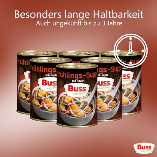 Buss Fertiggerichte – Gemüsesuppe nach chinesischer Art – Süß-sauer Asia Suppe mit Ananas und exotischem Gemüse – Suppen für die Mikrowelle in Konserven – Lange haltbar – 12 x 400 g