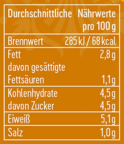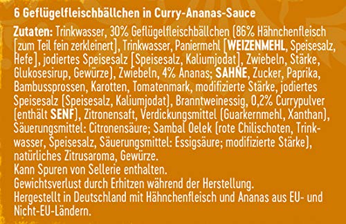6 Geflügelfleischbällchen in Curry-Ananas-Sauce Zutaten: Trinkwasser, 30% Geflügelfleischbällchen (86% Hähnchenfleisch [zum Teil fein zerkleinert], Trinkwasser, Paniermehl [WEIZENMEHL, Speisesalz, Hefe], jodiertes Speisesalz [Speisesalz, Kaliumjodat], Zwiebeln, Stärke, Glukosesirup, Gewürze), Zwiebeln, 4% Ananas; SAHNE, Zucker, Paprika, Bambussprossen, Karotten, Tomatenmark, modifizierte Stärke, jodiertes Speisesalz (Speisesalz, Kaliumjodat), Branntweinessig, 0,2% Currypulver (enthält SENF), Zitronensaft, Verdickungsmittel (Guarkernmehl, Xanthan), Säuerungsmittel: Citronensäure; Sambal Oelek (rote Chilischoten, Trinkwasser, Speisesalz, Säuerungsmittel: Essigsäure; modifizierte Stärke), natürliches Zitrusaroma, Gewürze.