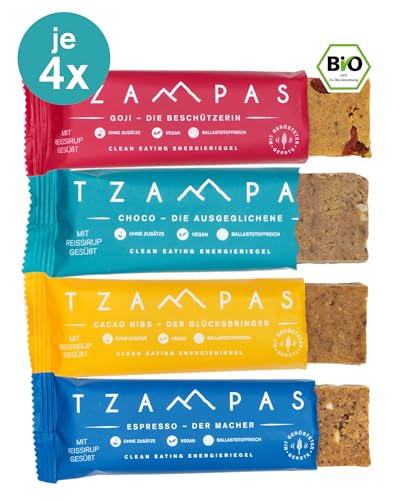 Energieriegel BIO von TZAMPAS® – 16x40g Riegel – 4 Sorten nachhaltige Sportriegel mit Superfoods für langfristige Energie – Vegan/Ohne Zusatz von raffiniertem Zucker