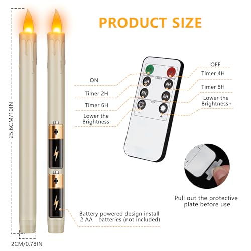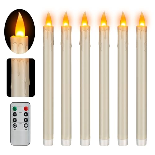 Flameless Taper Candles Realistic Flickering Flame, Battery Operated, Remote Control with Timer, Safe for Kids & Pets, Ivory, 10-Inch, Pack of 6 Ideal for Home, Weddings & Parties