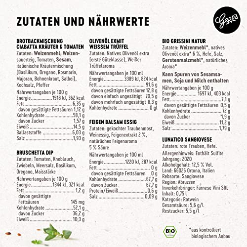 KULINARISCHE REISE NACH ITALIEN: Unsere köstliche Geschenkbox nimmt Sie mit auf eine aromatische Italienreise: fruchtig-weicher Rotwein aus den Abruzzen, Ciabatta-Brotbackmischung mit Kräutern & Tomaten, veganer Bruschetta-Dip, abgerundet mit edlem Olivenöl mit weißem Trüffel, Feigen Balsam Essig & italienischen BIO Grissini. ***Aktuell wird statt dem Feigen Balsam Essig Dattel Balsam Essig in der Geschenkbox versendet***