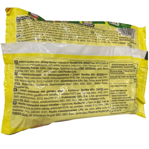 NOODLES 94 Prozent: WEIZENmehl, raffiniertes Palmöl (raffiniertes Palmöl, Antioxidationsmittel E319), Salz, Säureregulatoren: E452, E501, E500, Verdickungsmittel: E412, Farbstoff: E101, WÜRZMITTELPULVER 5,6 Prozent: Salz, Zucker, Aroma (enthält FISCH, SOJAbohnen), Knoblauch, Geschmacksvertärker: E621, E631, E627, Weißer Pfeffer; CHILIPULVER 0,4 Prozent