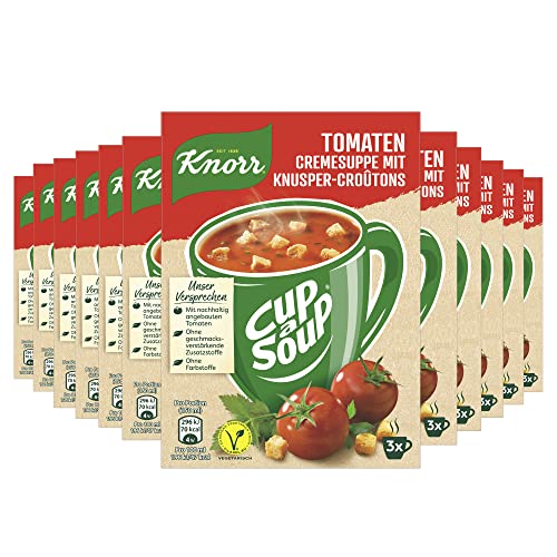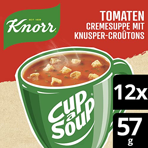 Mit Knorr Cup a Soup Tomaten Cremesuppe mit Knusper-Croûtons lässt sich einfach eine leckere Suppe für zwischendurch zubereiten. Sie ist die perfekte Fertigsuppe, wenn es mal schnell gehen muss! Guter Geschmack liegt dabei in unserer Natur – Unsere Chefköche sind überzeugt, dass guter Geschmack und hochwertige Zutaten aus verantwortungsvoller Landwirtschaft kommen. Darum verwenden wir in unserer Knorr Cup a Soup Gemüsesuppe nur Tomaten aus nachhaltigem Anbau. Zubereitung: Beutelinhalt in eine Tasse geben. Mit 150 ml kochendem Wasser übergießen und kräftig umrühren. 1 Minute ziehen lassen. Guten Appetit! Leckere, schnelle Suppe oder Tassensuppe praktisch in der Tasse: Die Knorr Cup a Soup Varianten bieten für jeden Geschmack das Richtige! Die Suppen sind ideal für den kleinen Hunger zwischendurch und perfekt, wenn es mal schnell gehen muss. Knorr Cup a Soup kann direkt in einer Tasse zubereitet und schon nach kürzester Zeit genossen werden. Sind schon die vielen weiteren Produkte von Knorr bekannt? Dank unserer Fix-Produkte, Brühen, Saucen, Fertiggerichten, Fertigsuppen und Salatdressings gelingt jedes Gericht garantiert mit wenigen Handgriffen. Schnell und einfach erhalten so authentische Mahlzeiten ihren typischen Geschmack – egal, ob abwechslungsreiche vegetarische oder vegane Küche, herzhafte Fleischgerichte oder leckere Gemüsevariationen. Dabei ist es die Komposition ausgewählter hochwertiger Zutaten, die jedes Knorr Produkt besonders macht. Knorr verarbeitet nur sorgfältig schonend getrocknete Zutaten, denn das Trocknen ist eine der ältesten Methoden, um Lebensmittel natürlich haltbar zu machen. Da der Geschmack und die Nährstoffe der frischen Zutaten weitgehend erhalten bleiben, passen Lebensmittel aus getrockneten Zutaten perfekt in unseren stressigen Alltag. Essen mit Knorr ist unkompliziert und sorgt darüber hinaus für ein gutes Gefühl: 95 Prozent der Zutaten kommen heute schon aus nachhaltigem Anbau. Denn wir bei Knorr glauben, dass die Verwendung nachhaltig angebauter und beschaffter Zutaten einen großen Unterschied für den Geschmack unserer Produkte, das Wohlbefinden der Landwirte und die Zukunft des Planeten macht. Knorr. Gutes, einfach lecker!