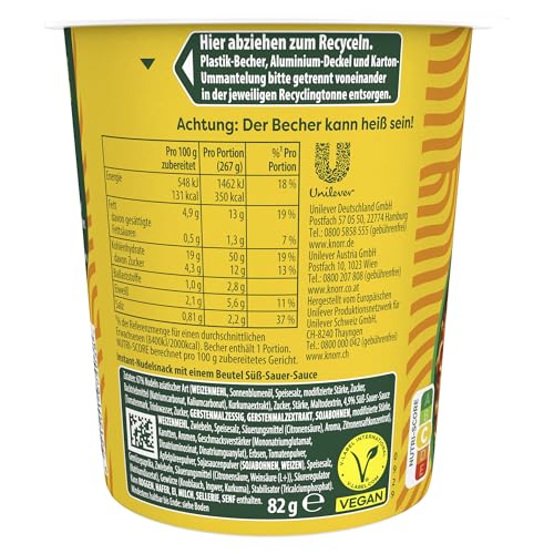 Zutaten: 67% Nudeln asiatischer Art (WEIZENMEHL, Sonnenblumenöl, Speisesalz, modifizierte Stärke, Zucker, Backtriebmittel (Natriumcarbonat, Kaliumcarbonat), Kurkumaextrakt), Zucker, Stärke, Maltodextrin, 4,9% Süß-Sauer-Sauce (Tomatenmark, Trinkwasser, Zucker, GERSTENMALZESSIG, GERSTENMALZEXTRAKT, SOJABOHNEN, modifizierte Stärke, WEIZENMEHL, Zwiebeln, Speisesalz, Säuerungsmittel (Citronensäure), Aroma, Zitronensaftkonzentrat), Karotten, Aromen, Geschmacksverstärker (Mononatriumglutamat, Dinatriuminosinat, Dinatriumguanylat), Erbsen, Tomatenpulver, Apfelpüreepulver, Sojasaucenpulver (SOJABOHNEN, WEIZEN), Speisesalz, Gemüsepaprika, Zwiebeln, Säuerungsmittel (Citronensäure, Weinsäure (L+)), Säureregulator (Natriumdiacetat), Gewürze (Knoblauch, Ingwer, Kurkuma), Stabilisator (Tricalciumphosphat). Kann ROGGEN, HAFER, EI, MILCH, SELLERIE, SENF enthalten.