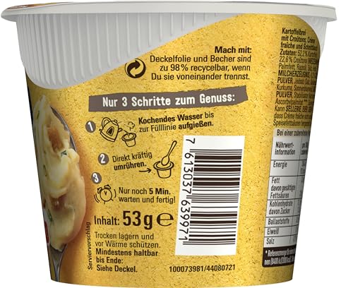 Zutaten: 52,2 % Kartoffeln, 22,6 % Croûtons (WEIZENMEHL, Palmfett, Rapsöl, Salz, Hefe), TROCKENMILCHERZEUGNIS, 4,2 % CRÈME-FRAÎCHE-PULVER, Jodsalz (Salz, Kaliumjodat), Stärke, Schnittlauch, Kurkuma, Sonnenblumenöl, MILCHEIWEISS, MAGERMILCHPULVER, Stabilisator Natriumcitrate**, Antioxidationsmittel Ascorbylpalmitat***, Säuerungsmittel Citronensäure. Kann SELLERIE, EIER, SENF und SOJA enthalten. **bewirken, dass Crème fraîche nicht ausflockt ***wird aus Vitamin C und Speisefettsäuren hergestellt & macht Crème fraîche haltbar.