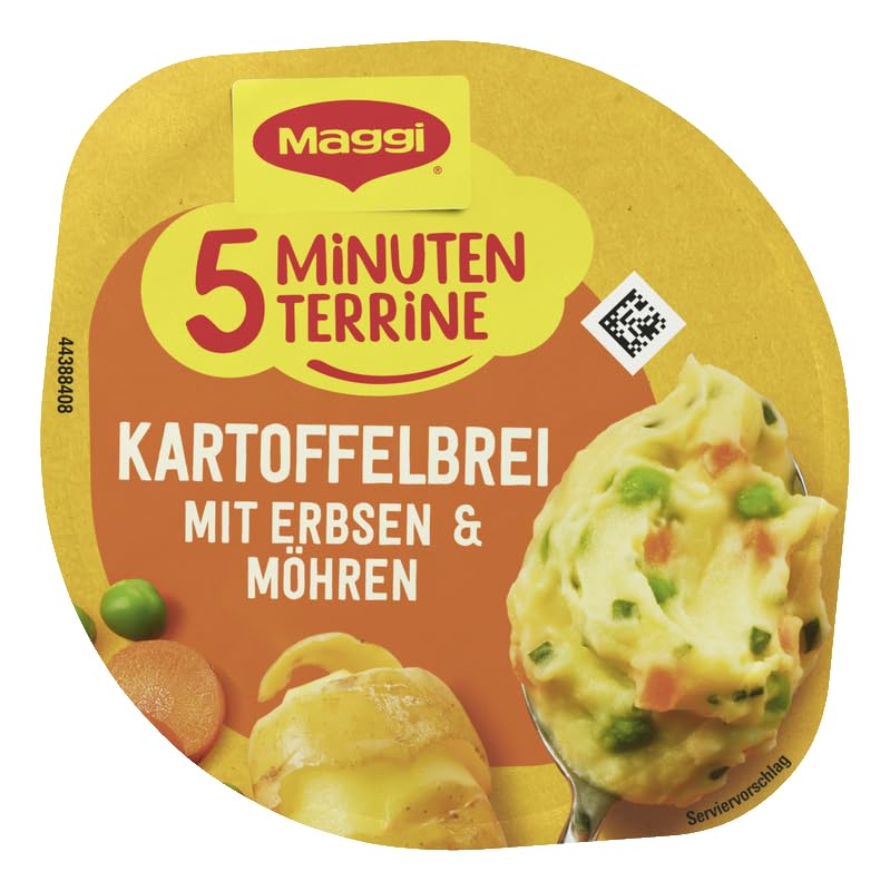 MAGGI 5 Minuten Terrine Kartoffelbrei mit Erbsen und Möhren ; cremig und unheimlich lecker