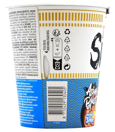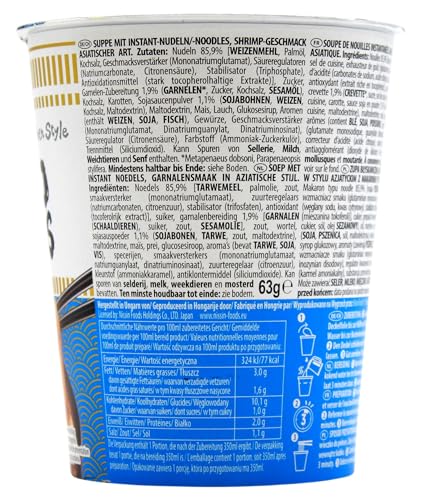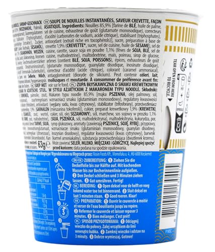 Zutaten: Nudeln 85,9% [WEIZENMEHL, Palmöl, Kochsalz, Geschmacksverstärker (E621), Mehlbehandlungsmittel (E500, E451), Antioxidationsmittel (E306), Säureregulator (Citronensäure)], Zucker, GARNELEN-Zubereitung [GARNELEN 1,4% (im trockenen Endprodukt), Zucker, Kochsalz, SESAMÖL], Kochsalz, Karotten, SOJASAUCENPULVER 1,1% (SOJABOHNEN, WEIZEN, Kochsalz, Maltodextrin), Mais, Frühlingszwiebeln, Maltodextrin, Glukosesirup, Aromen (enthält WEIZEN, SOJA, FISCH), Pfeffer 0,5%, Gewürze, Geschmacksverstärker (E621, E627, E631), Säureregulator (Citronensäure), Farbstoff (E150c), Trennmittel (E551). Kann Spuren von Sellerie, Milch, Weichtieren und Senf enthalten.