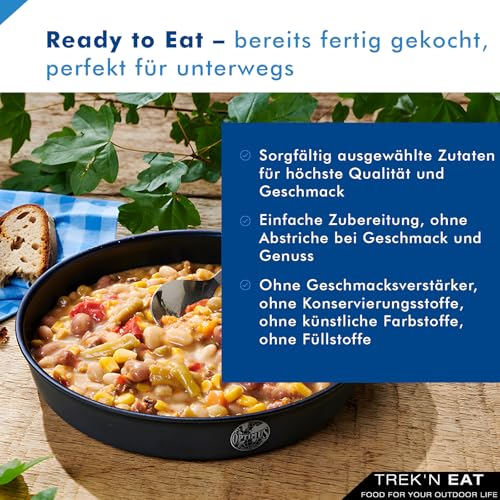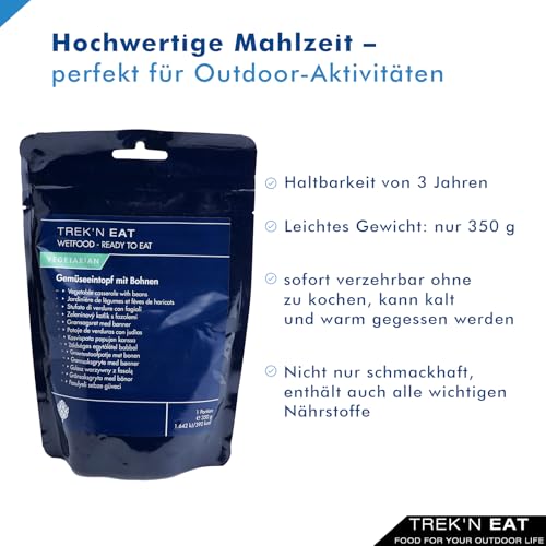 Der TREK’N EAT Gemüseeintopf mit Bohnen-RTE ist die perfekte Mahlzeit für alle, die auf Outdoor-Abenteuer, Reisen oder lange Trekkingtouren nicht auf eine nahrhafte, ausgewogene Mahlzeit verzichten möchten. Dieses Ready-to-Eat-Gericht ist sofort verzehrfertig – einfach die Verpackung öffnen und genießen, ohne Kochen oder Zubereitung. Der Eintopf aus einer köstlichen Kombination aus Bohnen und frischem Gemüse ist ideal für unterwegs, Camping oder als Notvorrat. Hergestellt aus natürlichen Zutaten und ohne künstliche Zusatzstoffe, Geschmacksverstärker oder Konservierungsmittel, garantiert der TREK’N EAT Gemüseeintopf mit Bohnen eine gesunde und authentische Mahlzeit, die deinen Körper mit wichtigen Nährstoffen versorgt. Der Eintopf ist nicht nur vegetarisch, sondern auch eine ausgezeichnete Quelle für Ballaststoffe und Vitamine, die dir die nötige Energie für dein nächstes Abenteuer liefern. Dank seiner langen Haltbarkeit eignet sich dieser Gemüseeintopf perfekt für Langzeitvorräte oder als Expeditionsnahrung. Die praktische Verpackung macht ihn zu einem leichten, platzsparenden Begleiter auf jedem Abenteuer, der immer bereit ist, dich zu versorgen – ohne zusätzlichen Aufwand. Ob beim Wandern, Camping oder auf einer langen Reise, der TREK’N EAT Gemüseeintopf mit Bohnen ist eine nahrhafte, unkomplizierte Mahlzeit, die dich unterwegs nicht im Stich lässt.