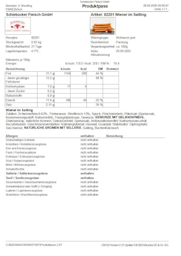 82% Schweinefleisch, Trinkwasser, Nitritpökelsalz (Kochsalz, Konservierungsstoff: E250), Gewürze, Dextrose, Gewürzextrakte, Stabilisator: E450, Würze, Säuerungsmittel: E330, E575, Antioxidationsmittel: E300, E301, Emulgator: E471, E472c, Glucosesirup, Verdickungsmittel: E412, Schafsaitling / Rindereiweißdarm, Rauch